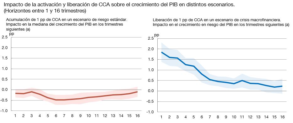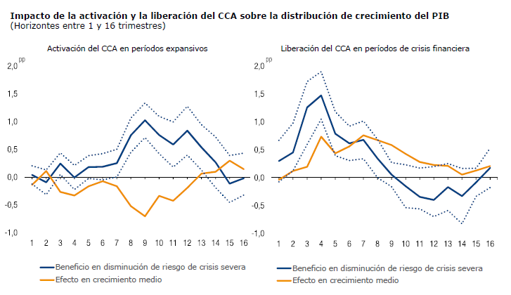 La activación del CCA en fases de riesgo sistémico cíclico estándar genera costes muy limitados en términos de pérdida de crecimiento de crédito y PIB. Por el contrario, la liberación de CCA durante períodos de crisis macrofinanciera genera beneficios importantes en la menor intensidad de contracciones de estas variables.