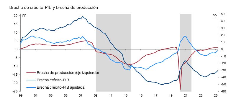 (464 KB). Documento Ocasional N.º 1603, Banco de España. La brecha de crédito-PIB se calcula como la diferencia en puntos porcentuales entre la ratio observada y su tendencia de largo plazo calculada aplicando un filtro estadístico de Hodrick-Prescott de una sola cola con un parámetro de suavizado igual a 25,000. Este parámetro está calibrado para ajustarse a los ciclos financieros observados históricamente en España. Véase Galán, J.E. (2019). Measuring credit-to-GDP gaps