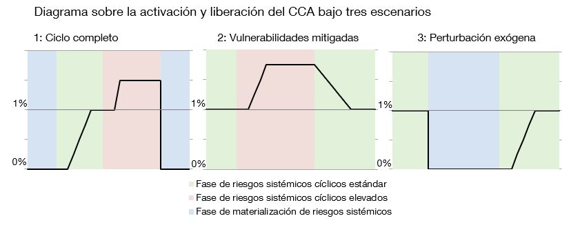 La mitigación de los riesgos sistémicos cíclicos elevados, retornando estos a un nivel estándar, llevaría a una liberación progresiva del CCA hasta un 1 % (véase panel 2 del diagrama).