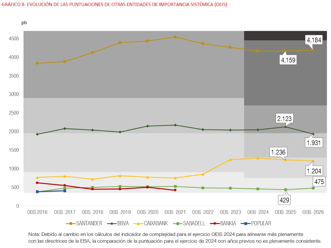 Notas: 1) Banco Popular fue adquirido por Santander en junio de 2017 y Bankia se integró en CaixaBank en marzo de 2021. 2) Los diferentes sombreados se corresponden con las subcategorías que determinan el porcentaje de colchón de OEIS aplicable a cada entidad en función de la puntuación (0,25%, 0,5%, 0,75%, 1%, 1,25% y 1,5%). 3) Los últimos datos han sido obtenidos en el ejercicio realizado en 2025, a partir de datos de 2024, que determina la relación de OEIS y sus colchones para 2026. 4) Debido al cambio en los cálculos del indicador de complejidad para el ejercicio OEIS 2024 para alinearse más plenamente con las directrices de la EBA, la comparación de la puntuación para el ejercicio de 2024 con años previos no es plenamente consistente.