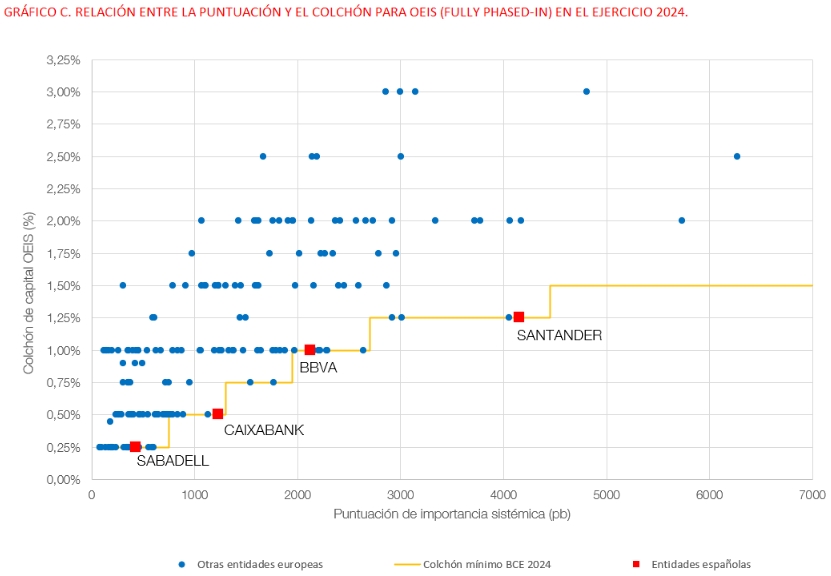 El gráfico C muestra la relación entre la puntuación de las entidades identificadas como OEIS en países de la Unión Bancaria Europea y los colchones exigidos por sus respectivas autoridades nacionales. La línea amarilla representa el nivel de referencia de colchones mínimos de O-SIIs establecido por el BCE. Se señalan en rojo las OEIS españolas, el resto de entidades (europeas) aparecen en azul.