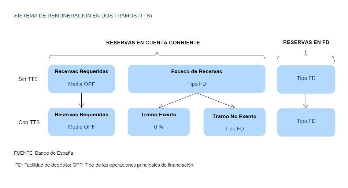 Con el fin específico de apoyar la transmisión de la política monetaria a través de las entidades de crédito al mismo tiempo que preservar los efectos positivos de los tipos de interés negativos en la orientación de la política monetaria (véase ¿qué significan los tipos de interés negativos?). El Consejo de Gobierno del Banco Central Europeo (BCE) aprobó introducir un sistema de dos tramos (two-tier system o TTS en inglés) para la remuneración de las reservas que las entidades mantenían en las cuentas corrientes de sus bancos centrales nacionales.
