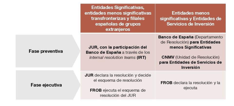 La Directiva de Recuperación y Resolución Bancaria permite a los Estados miembros optar por centralizar las funciones de resolución en una misma autoridad de resolución, o bien asignar estas funciones a autoridades distintas. Ésta última opción ha sido la elegida en el caso español, atribuyendo las funciones de resolución preventiva al Banco de España (para entidades de crédito) y a la CNMV (para empresas de servicios de inversión). Las funciones de resolución ejecutiva se atribuyen para ambos tipos de entidades al FROB. Según se establece en la Ley 11/2015, las autoridades de resolución deben colaborar y facilitarse la información que resulte necesaria para el ejercicio de sus competencias. A dichos efectos, el Banco de España y el FROB firmaron un Convenio de Colaboración