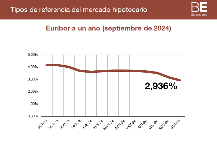 El índice euríbor a un año, que es utilizado como principal referencia para fijar el tipo de interés de los préstamos hipotecarios concedidos por las entidades de crédito españolas, baja en septiembre hasta el 2,936% desde el 3,166% del mes anterior. Tomando como referencia los últimos 12 meses, el índice registra un descenso de 1,213 puntos.