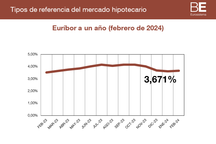 El índice euríbor a un año, que es utilizado como principal referencia para fijar el tipo de interés de los préstamos hipotecarios concedidos por las entidades de crédito españolas, sube en febrero hasta el 3,671% desde el 3,609% del mes anterior. Tomando como referencia los últimos 12 meses, el índice registra un aumento de 0,137 puntos.