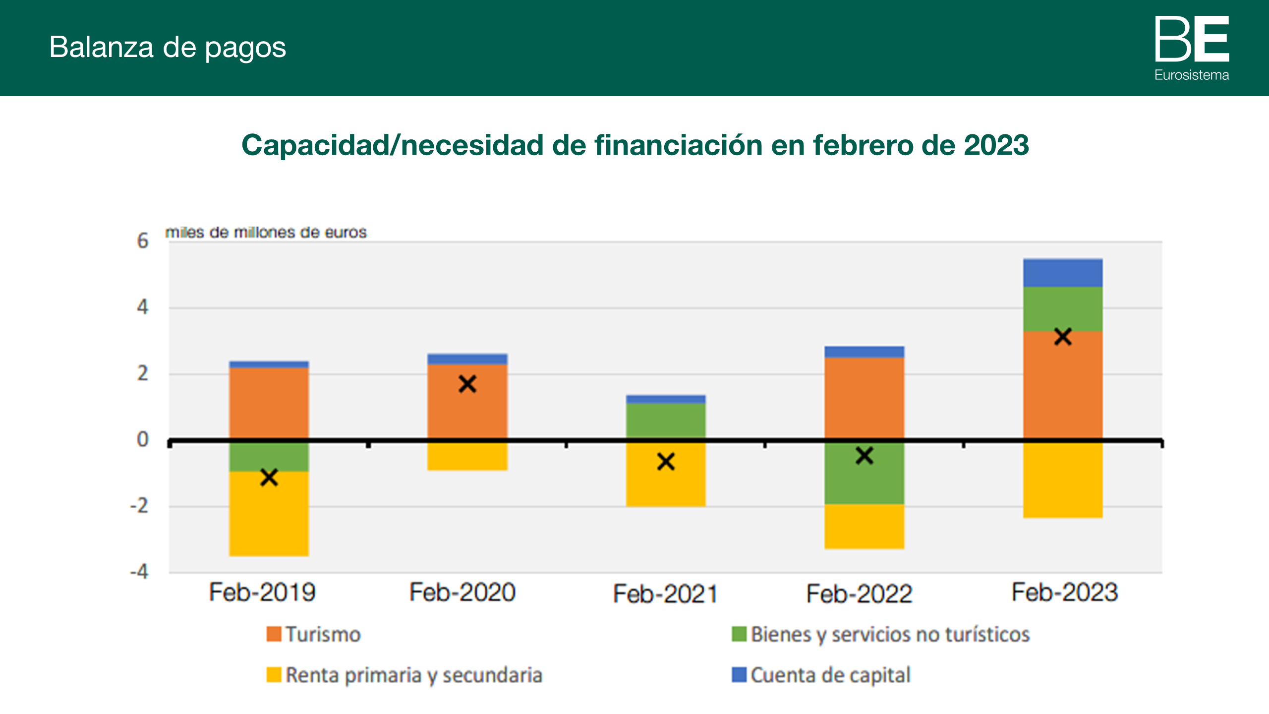 La capacidad de financiación de la economía española fue de 3,1 mm en febrero de 2023, frente a la necesidad de financiación de 0,5 mm de un año antes