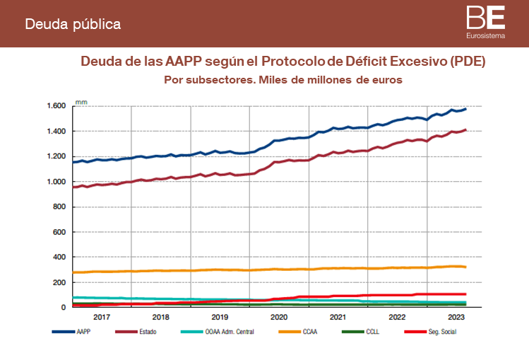 Respecto a las administraciones territoriales, la deuda de las Comunidades Autónomas creció hasta los 324 mm de euros en octubre de 2023, con una variación interanual del 2,4%, mientras que la deuda de las Corporaciones Locales se situó en 23 mm de euros en este mes, lo que supone un 0,8% más que el saldo registrado en octubre de 2022.