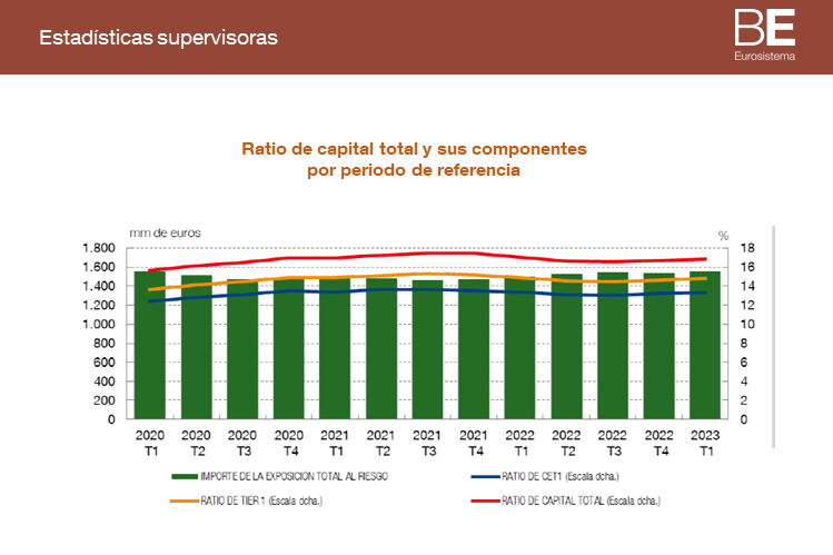 Las ratios de capital de las entidades de crédito que operan en España aumentaron ligeramente en el primer trimestre de 2023. La ratio de capital de nivel ordinario (CET1) se situó en el 13,32 % frente al 13,23 % del trimestre anterior. No obstante, siguió siendo ligeramente inferior al 13,36 % registrado en el mismo trimestre del año previo