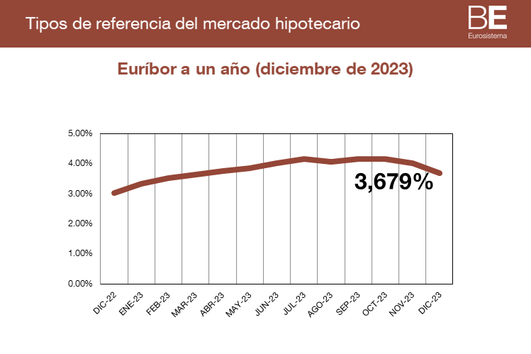 El índice euríbor a un año, que es utilizado como principal referencia para fijar el tipo de interés de los préstamos hipotecarios concedidos por las entidades de crédito españolas, baja en diciembre hasta el 3,679 desde el 4,022% del mes anterior. Tomando como referencia los últimos 12 meses, el índice registra un ascenso de 0,661 puntos.
