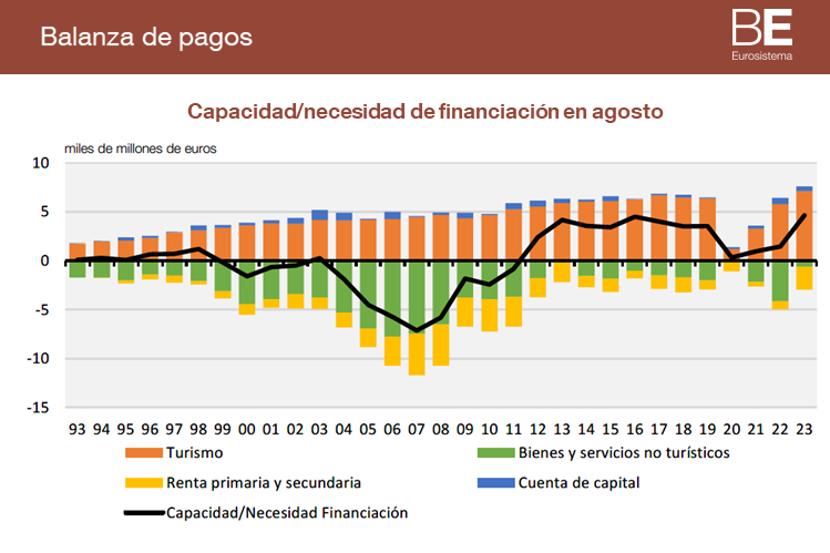 La capacidad de financiación de la economía española se situó en agosto de 2023 en el máximo histórico para ese mes, debido a la recuperación del turismo y al menor déficit de los bienes y servicios no turísticos.