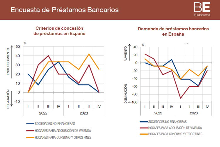 Según la Encuesta de Préstamos Bancarios, durante el cuarto trimestre de 2023, los criterios de concesión dejaron de endurecerse en España o lo hicieron de forma más moderada que en los trimestres previos.