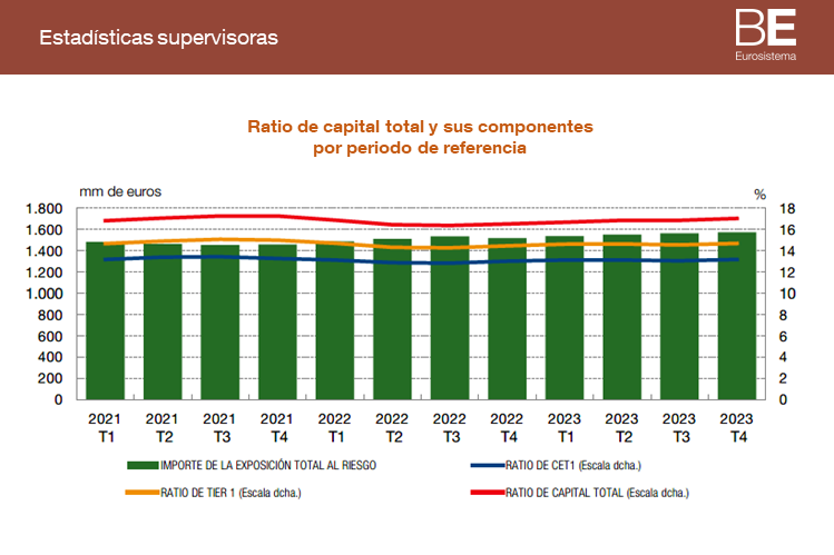 Las ratios de capital de las entidades de crédito que operan en España se mantuvieron relativamente estables en el cuarto trimestre de 2023, aumentado levemente respecto al mismo periodo del año precedente. En particular, la ratio de capital de nivel 1 ordinario (CET1) se situó en el 13,20% frente al 13,04% del cuarto trimestre de 2022.