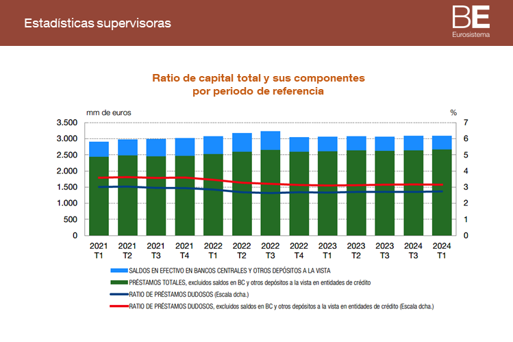 Las ratios de capital de las entidades de crédito que operan en España se mantuvieron relativamente estables en el primer trimestre de 2024. En particular, la ratio de capital de nivel 1 ordinario (CET1) se situó en el 13,19 % frente al 13,14 % registrado en el primer trimestre de 2023.