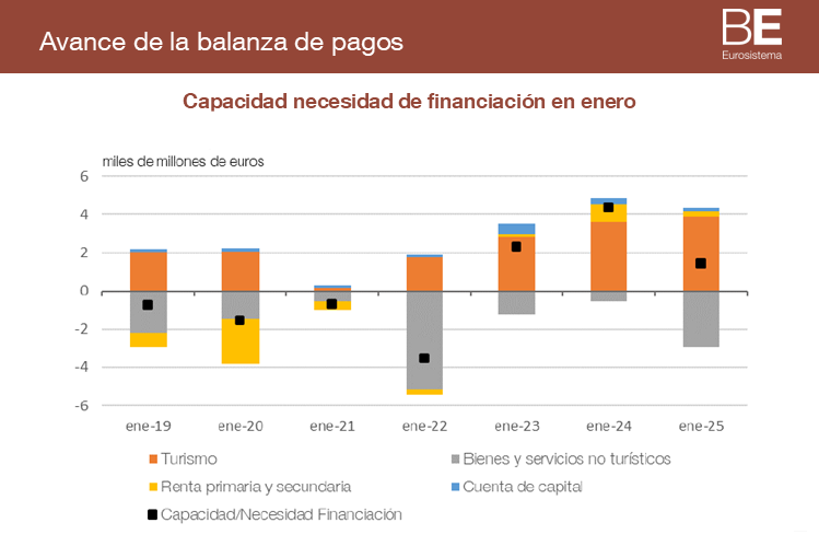 La capacidad de financiación de la economía española fue de 1,4 miles de millones de euros (mm) en enero de 2025, frente a los 4,3 mm de un año antes