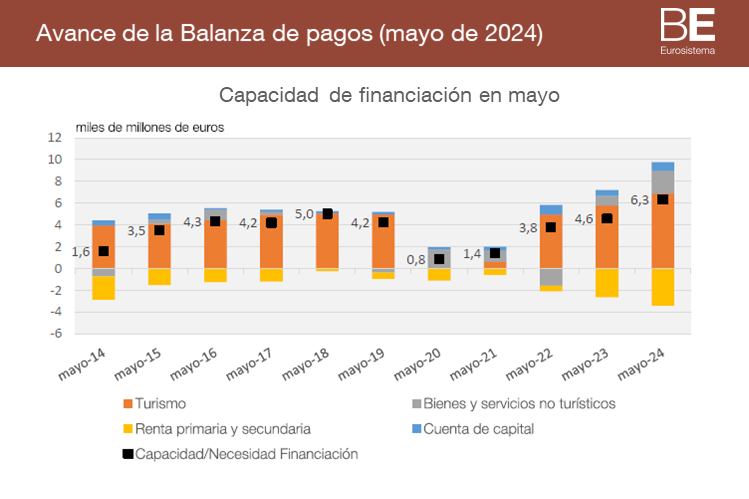 La capacidad de financiación de la economía española fue de 6,3 miles de millones de euros en mayo de 2024, superior a la del mismo mes de años anteriores