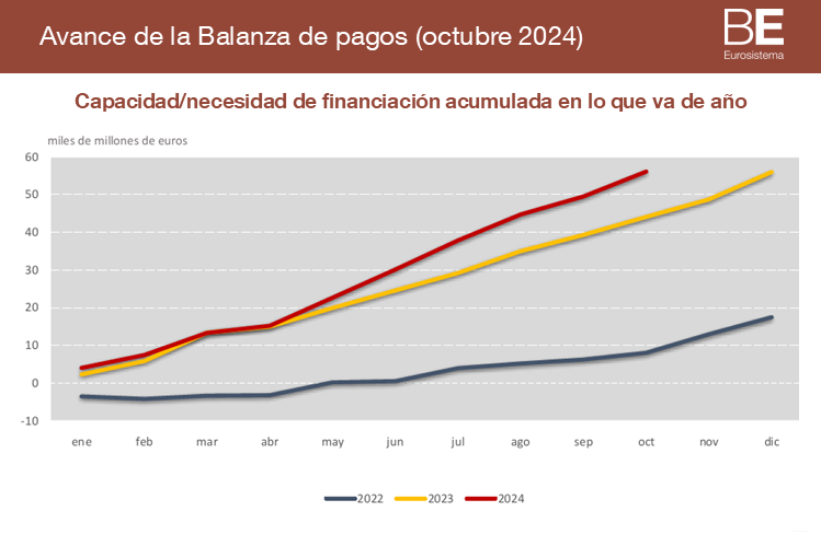 La capacidad de financiación de la economía española fue de 6,6 miles de millones de euros (mm) en octubre de 2024, frente a 4,8 mm un año antes