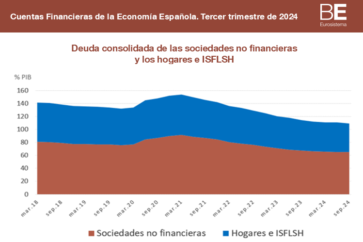 La deuda de empresas y hogares se situó en septiembre de 2024 en 1.709 miles de millones de euros (mm), lo que supone un 109% del PIB, cinco puntos por debajo del 114,4% de un año antes.