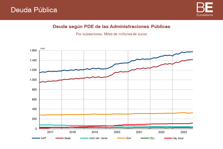 Respecto a las administraciones territoriales, la deuda de las Comunidades Autónomas creció hasta los 325 mm de euros en diciembre de 2023, con una variación interanual del 2,6%, mientras que la deuda de las Corporaciones Locales se situó en 23 mm de euros en este mes, lo que supone un 1,1% más que el saldo registrado en diciembre de 2022.