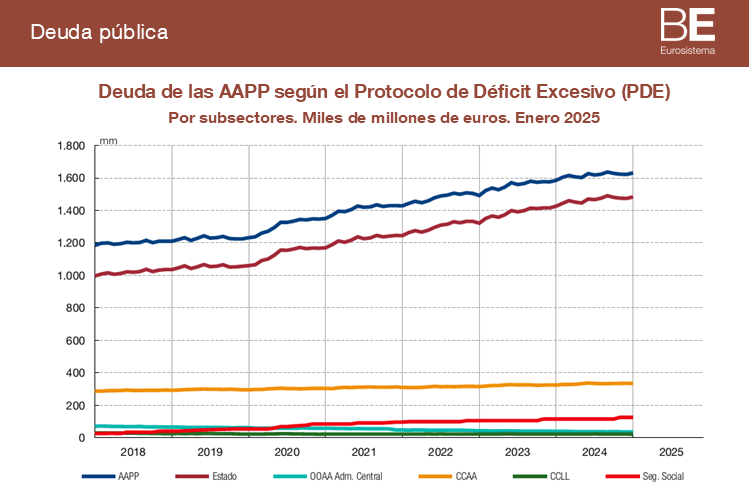 La deuda de las Administraciones Públicas se situó en 1.630 mm de euros en enero de 2025, con un crecimiento del 2,8% interanual