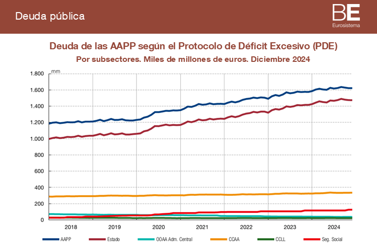 Con los datos de avance disponibles, el saldo de la deuda de las Administraciones Públicas (AAPP) según el Protocolo de Déficit Excesivo (PDE) se situó en 1.622 miles de millones (mm) de euros en diciembre de 2024, con una tasa de crecimiento interanual del 2,9%. La ratio de deuda en relación al PIB nominal se situó en el 101,8% en el año 2024, con un descenso de 3,3 puntos porcentuales (pp) respecto a 2023 y de 22,4 pp desde el máximo registrado en marzo de 2021 (124,2% del PIB).