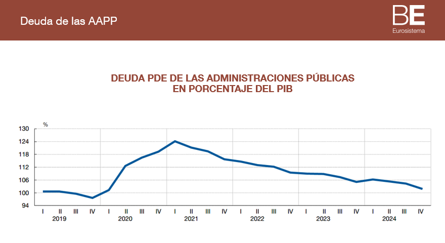 La deuda de las Administraciones Públicas se situó en el cuarto trimestre de 2024 en el 101,8% del PIB, 3,3 pp menos que a finales de 2023
