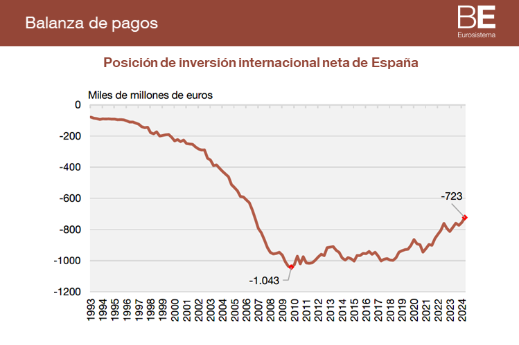La posición de inversión internacional se situó en el -48,1% del PIB en el 2º trimestre de 2024, frente al -51% del trimestre anterior