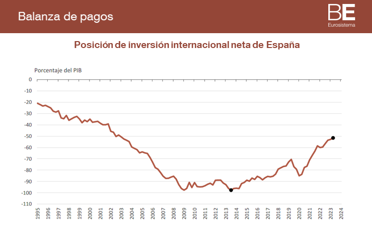 La posición de inversión internacional se situó en el -51,6% del PIB en el primer trimestre de 2024, frente al -52,8% del trimestre anterior