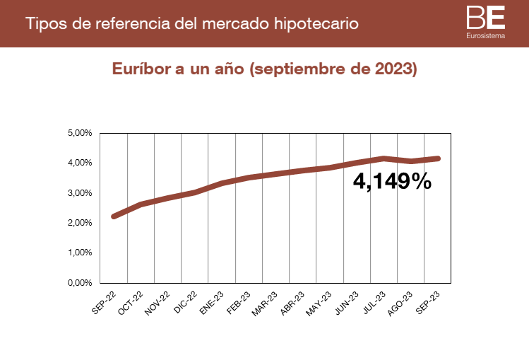 El índice euríbor a un año, que es utilizado como principal referencia para fijar el tipo de interés de los préstamos hipotecarios concedidos por las entidades de crédito españolas, sube en septiembre hasta el 4,149% desde el 4,073% del mes anterior. Tomando como referencia los últimos 12 meses, el índice registra un ascenso de 1,916 puntos.
