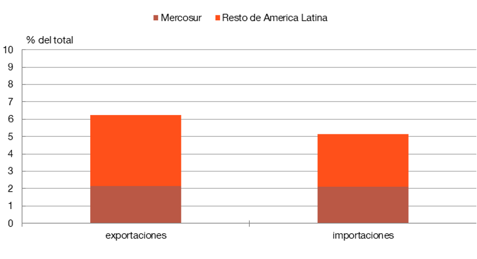 El acuerdo facilitaría el comercio entre dos regiones con fuertes vínculos económicos. Como se observa en el gráfico 1, la UE supone más del 10% del comercio de Mercosur. Aunque Mercosur solo representa el 2% del comercio exterior de la UE con otros países, hay sectores concretos y estratégicos, como el de alimentos y las materias primas, en los que supone el 13% y el 14%, respectivamente, de las importaciones comunitarias.