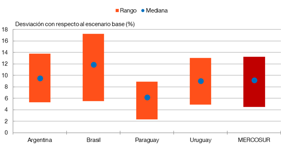NOTAS: El escenario base sería el que no considera el acueerdo comercial. El rango y la mediana se han calculado a partir de los resultados de las simulaciones realizadas en los trabajos de Timini y Viani (2022)