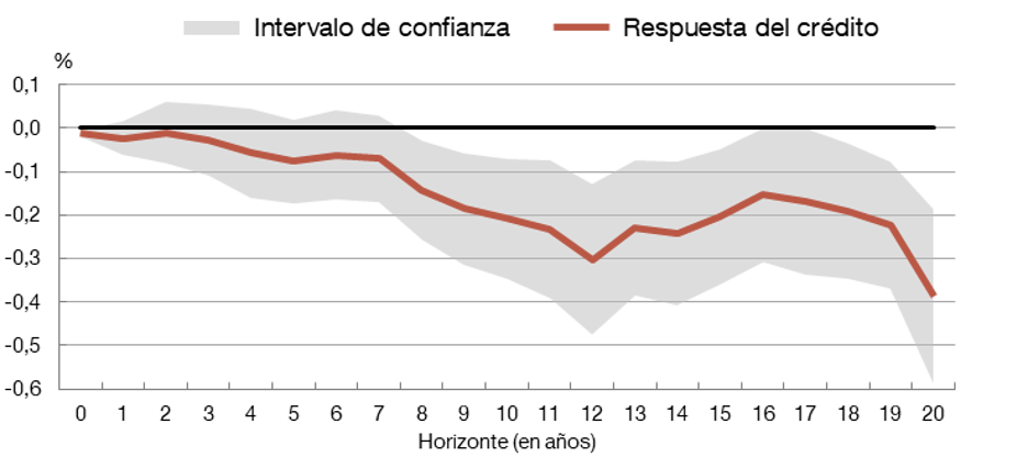 La conclusión del estudio es que la mayor aridez reduce el crédito a las empresas, aunque de forma gradual. Como muestra el gráfico 2, se precisan más de ocho años para que este efecto sea estadísticamente significativo. Por cada punto porcentual de aumento de la aridez, el crédito caería un 0,25 % entre 8 y 20 años después.