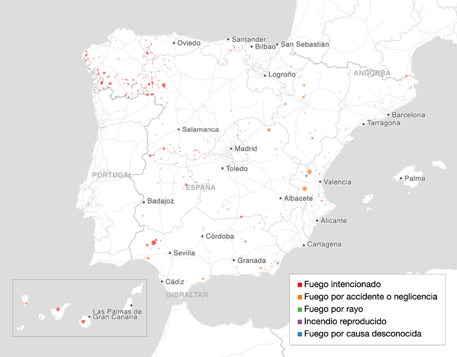 NOTA: Incendios de 500 hectáreas o más. El tamaño de los puntos se corresponde con el tamaño real de la superficie quemada.