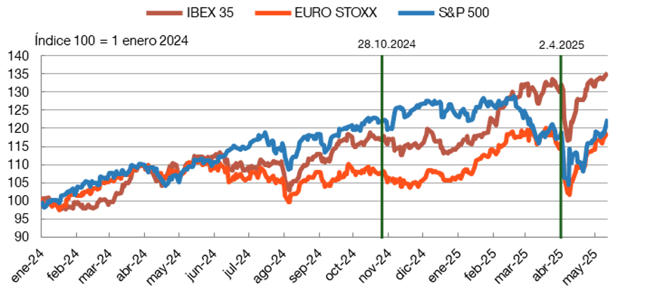 NOTAS: El 28 de octubre de 2024 es la fecha de cierre del Informe de Estabilidad Financiera anterior; el 2 de abril de 2025 es el 'día de la liberación', que supone el anuncio del aumento masivo y generalizado de los aranceles por parte de Estados Unidos. Última observación: 12 de mayo de 2025.