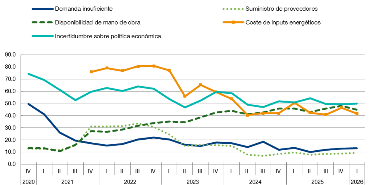 , correspondiente al primer trimestre de 2026. Frente a estos condicionantes, cuestiones como el acceso a la financiación o la demanda han tenido, en promedio, una incidencia relativamente menor. Este tipo de información ayuda a entender mejor las decisiones empresariales en cada momento.
