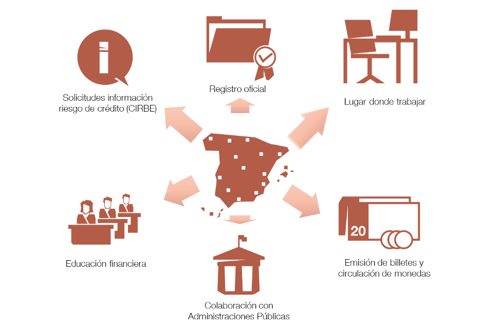 Las sucursales del Banco de España operan con entidades de crédito y ofrecen distintos servicios al público en la actualidad, recogidos en el esquema 2: