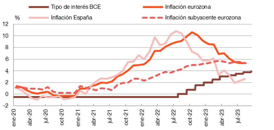 NOTA: El tipo de interés es el de la facilidad de depósito del BCE. La inflación de la eurozona y de España es el crecimiento interanual del Índice Armonizado de Precios de Consumo (IAPC) en la eurozona y España, respectivamente. La inflación subyacente excluye la energía y los alimentos.