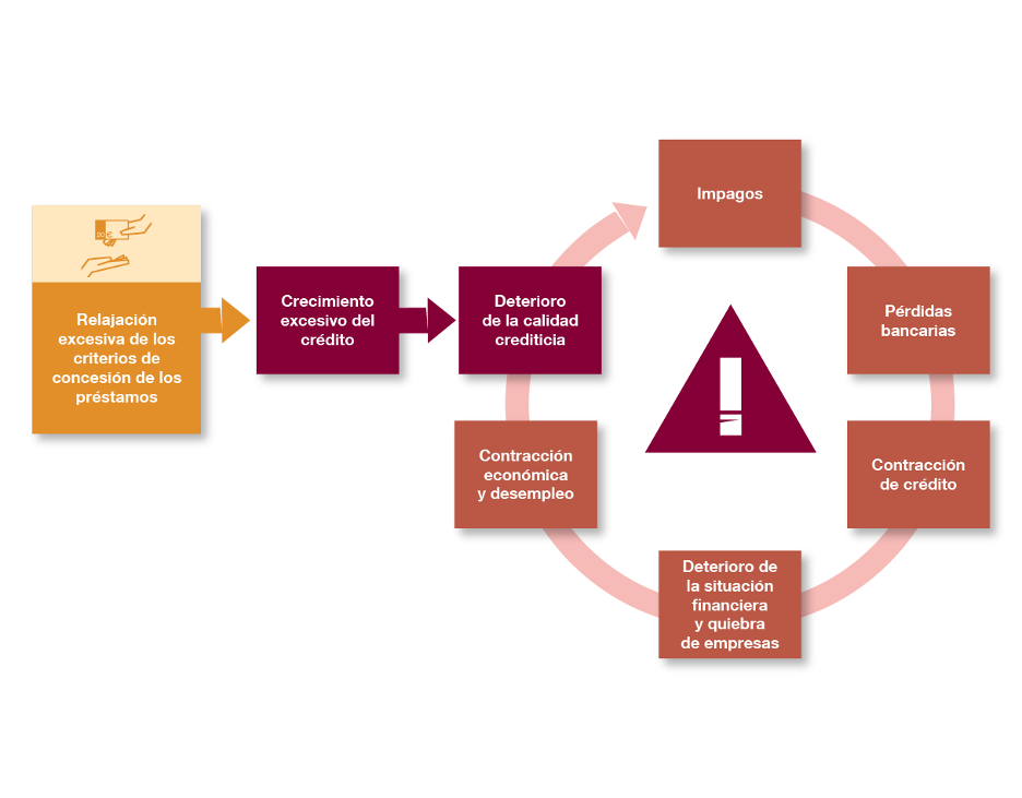 El esquema 1 ilustra cómo una relajación excesiva en los criterios de concesión de los préstamos bancarios reduce su calidad crediticia, merma la capacidad futura de las empresas para pagar sus créditos e incrementa los impagos. Los impagos, a su vez, afectan a los bancos y pueden arrastrar a otras empresas, a la actividad, al empleo y a la estabilidad financiera en su conjunto, en un círculo vicioso difícil de revertir.