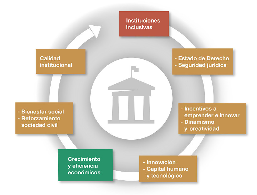 Las instituciones inclusivas facilitan la creación de riqueza y el desarrollo de la sociedad civil, conformando un círculo virtuoso de crecimiento económico y mejora de las instituciones