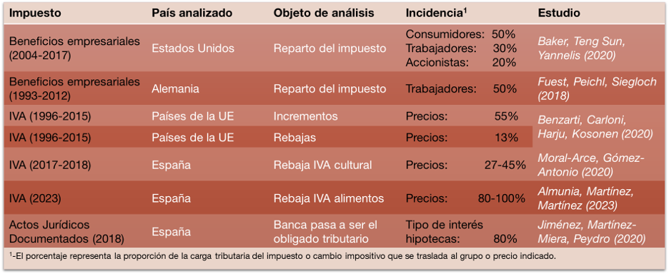 Los análisis de incidencia impositiva permiten conocer quién acaba pagando realmente los impuestos. En los últimos años, han proliferado este tipo de estudios gracias al acceso de los investigadores a datos administrativos individuales de los contribuyentes. La tabla 1 recoge algunos de los trabajos más recientes, muchos de los cuales usan estos microdatos tributarios.