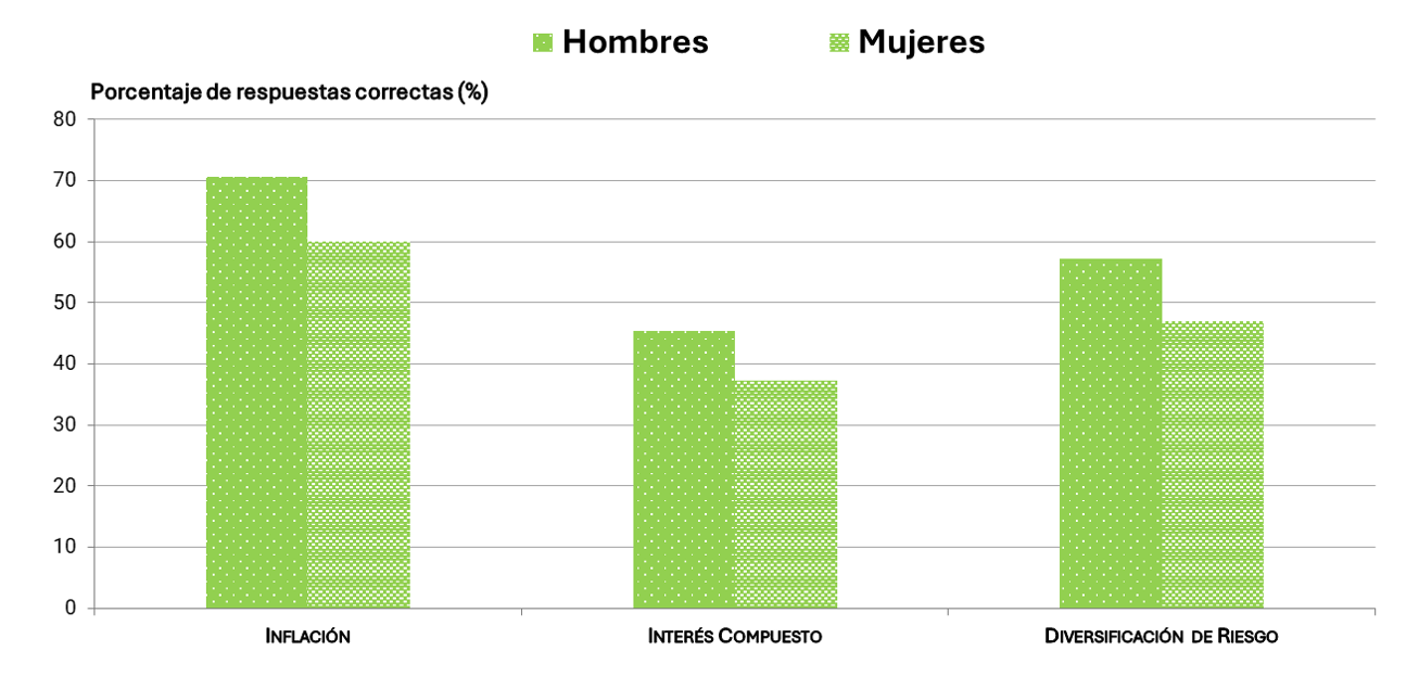 Si comparamos hombres y mujeres con el mismo nivel educativo, mismas habilidades numéricas/lectoras, interés o experiencia en finanzas, etc., el porcentaje en respuestas correctas en preguntas financieras es más parecido. Pero sigue siendo mayor para los hombres que para las mujeres.