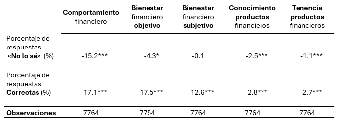 Los números de la tabla muestran la correlación con cada uno de los indicadores financieros. Así, por ejemplo, un aumento de 1 punto porcentual en el porcentaje de respuestas «no lo sé» se asocia con 15 puntos menos en el índice de comportamiento financiero.
