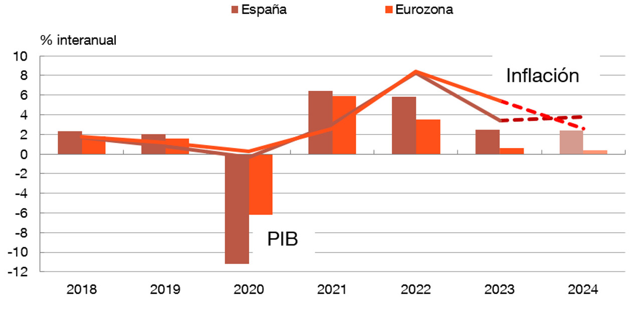 NOTA: Las barras representan el crecimiento interanual del Producto Interior Bruto (PIB) y las líneas la tasa interanual de inflación (índice de precios al consumo armonizado). Para 2024 se representa el avance del crecimiento del PIB en el primer trimestre y el indicador adelantado de inflación del mes de mayo.
