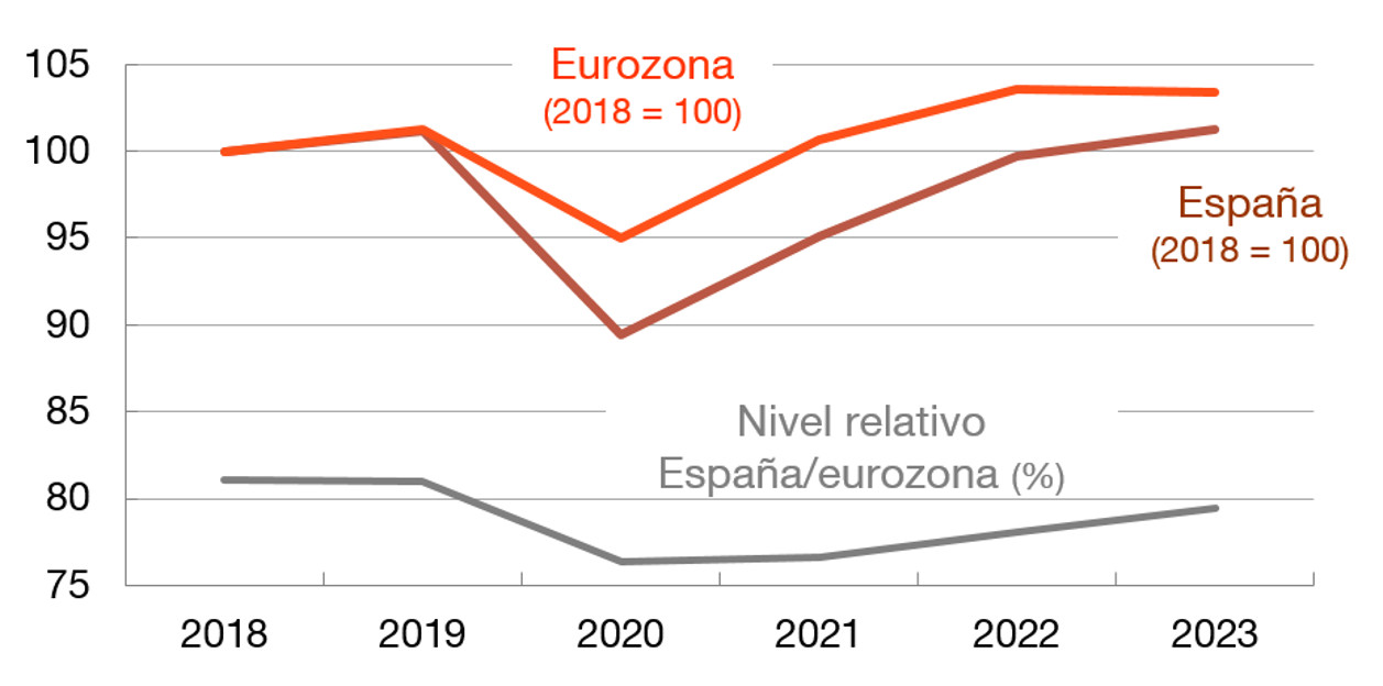 NOTA: PIB per cápita en términos reales para España (línea marrón) y la eurozona (naranja). El nivel para el año inicial (2018) se establece en 100 y se muestra su evolución respecto a este nivel inicial. La línea gris representa el nivel relativo de renta per cápita de España respecto a la eurozona, en porcentaje.