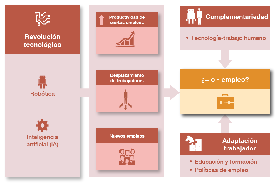 En la actualidad, se está produciendo una nueva revolución tecnológica basada en el desarrollo de la robótica y de la IA. Máquinas y algoritmos están ya realizando de forma autónoma tareas (rutinarias o no, especializadas o no) que antes solo podían hacer personas. Como en revoluciones tecnológicas anteriores, esta perspectiva genera preocupación por la posibilidad de que la destrucción de empleo aumente (mecanismo desplazamiento) y de que la creación de empleo no la compense (mecanismos productividad y aparición de nuevos trabajos).