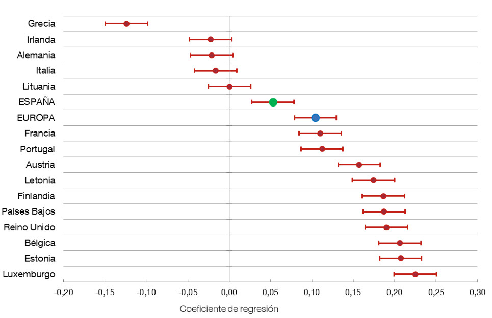 -Cada punto representa el coeficiente de la regresión, es decir, la correlación condicionada, entre la exposición potencial a la IA de las distintas ocupaciones en un país y los cambios de su peso en el empleo total entre 2011 y 2019. La barra en torno al punto representa el rango de error estándar con un 95 % de confianza. Si la barra atraviesa el cero significa que el efecto no es estadísticamente significativo.