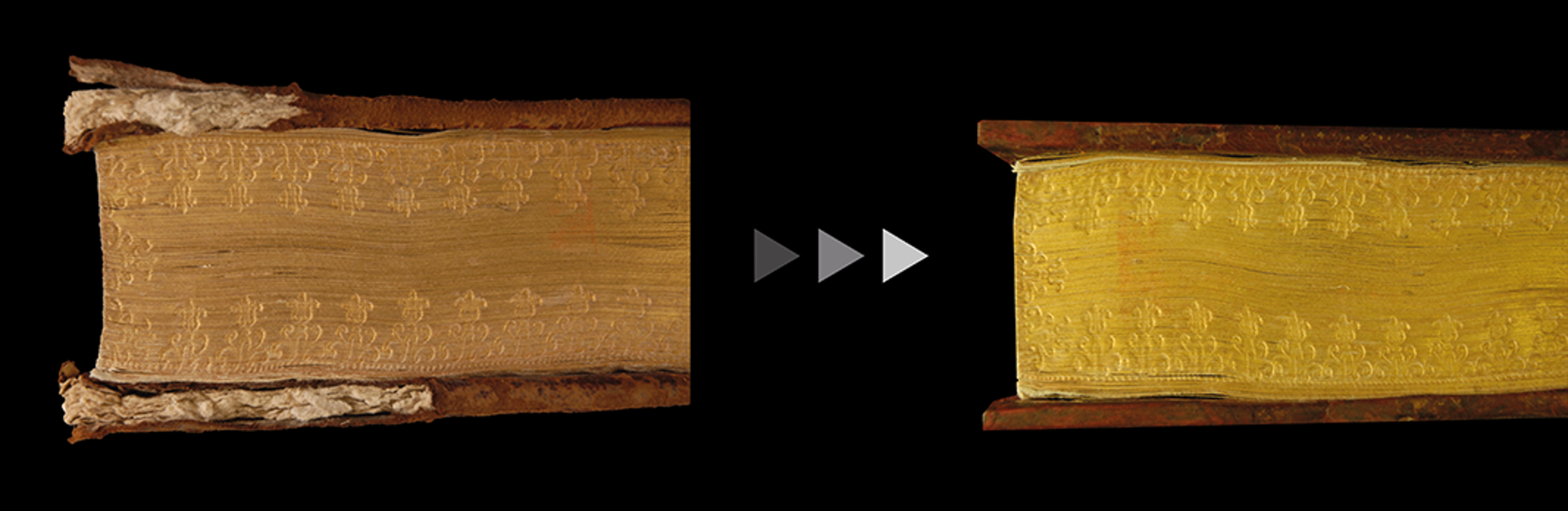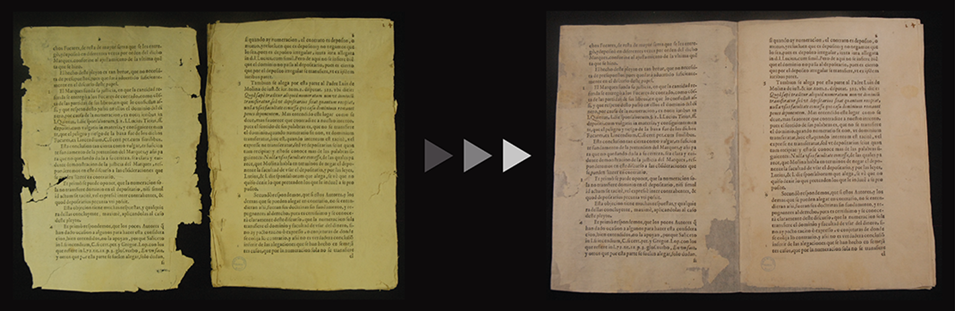 Las técnicas de consolidación, que refuerzan las partes debilitadas, logran que páginas deterioradas de libros centenarios vuelvan a su estado original (composición 2) y con las de reintegración, los tomos recobran totalmente su estética y funcionalidad (composición 3).