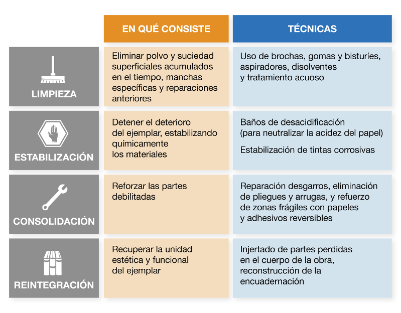 La restauración se plantea cuando un ejemplar presenta daños y si, tras analizarlos, se puede determinar qué tipo de intervención conviene (esquema 1). Son trabajos que realizan los expertos en libros antiguos y en las técnicas para su restauración. Estas van desde la mera limpieza de los ejemplares a procedimientos de desacidificación del papel, reparación de daños por agua, por fuego o por insectos, así como roturas y otros daños debidos a la manipulación.