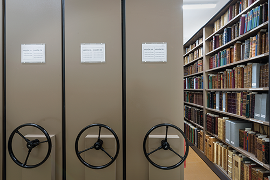 La preservación engloba todos los trabajos y procedimientos encaminados a evitar daños a las obras. Para ello, contamos con un depósito en el que los volúmenes se mantienen bajo condiciones ambientales óptimas y protegidos con medidas de seguridad eficaces (imagen 1).