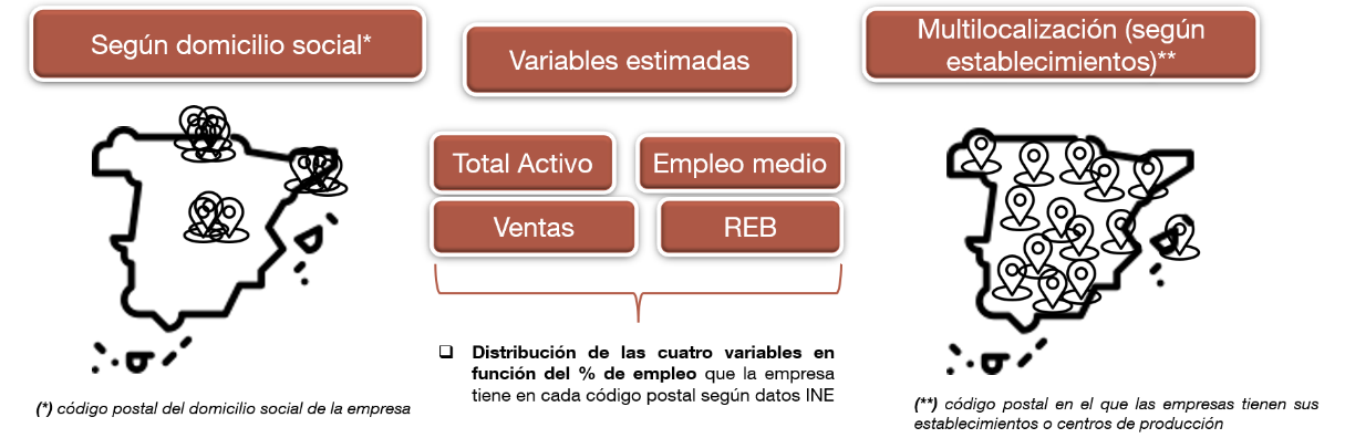 ViME informa de la distinta distribución geográfica de cuatro variables (empleo, activo, ventas y resultado económico bruto) de las sociedades no financieras españolas (no incluye información de empresarios autónomos) según se considere el domicilio social o los centros de producción, para los años 2022 y 2023.