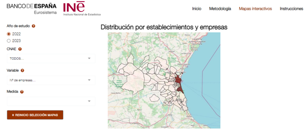 La herramienta de visualización permite navegar a través de mapas interactivos seleccionando la comunidad autónoma, provincia y municipio, con detalle por código postal, y con información a diciembre de cada año. La elección regional referida se realiza para las cuatro variables analizadas y 14 secciones de la CNAE 2009. El acceso a la herramienta, instrucciones de uso y metodología empleada está en ViME